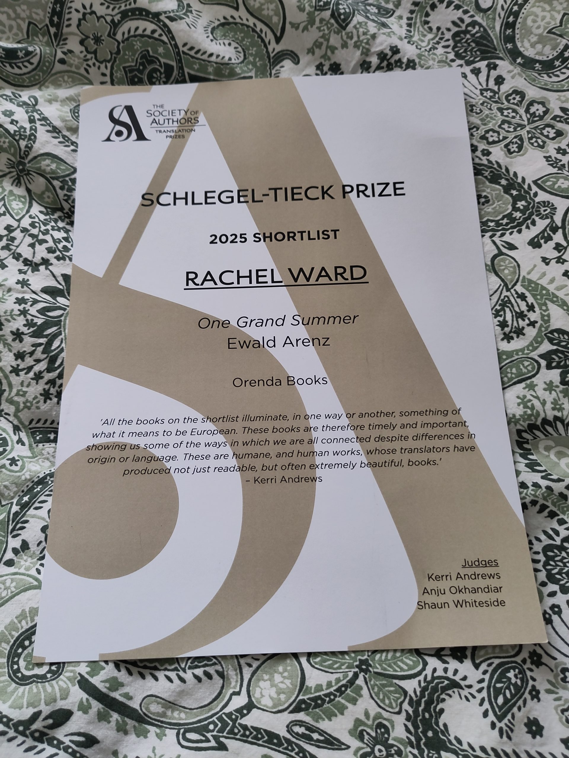 It was an honour to be shortlisted again for the Society of Authors' Schlegel-Tieck Prize for One Grand Summer by Ewald Arenz (Orenda Books). The Translation Awards ceremony was held at the British Library on 10 February, and the prize was awarded to Jon Cho-Polizzi for a translation of Djinns by Fatma Aydemir (Peirene Press), with runner up Alexandra Roesch for a translation of Boy With a Black Rooster by Stefanie vor Schulte (The Indigo Press). The 2025 Schlegel-Tieck Prize Shortlist Jon Cho-Polizzi for a translation of Djinns by Fatma Aydemir (Peirene Press) Charlotte Collins for a translation of Darkenbloom by Eva Menasse (Scribe Publications) Charlotte Collins for a translation of The Granddaughter by Bernhard Schlink (Weidenfeld & Nicolson, The Orion Publishing Group) Gesche Ipsen for a translation of The Green Ages: Medieval Innovations ...